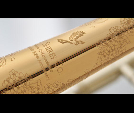 ニューヨーク・フィルハーモニック トロンボーン奏者 コリン・ウイリアムズ氏のアーティストモデルに三木楽器200周年を記念した特別デザインの彫刻が施されている数量限定記念モデル。彫刻デザインは日本を代表する「桜」と「ヒヨドリ」をモチーフにした特別オーダーの彫刻となっております。