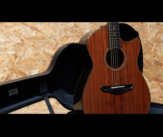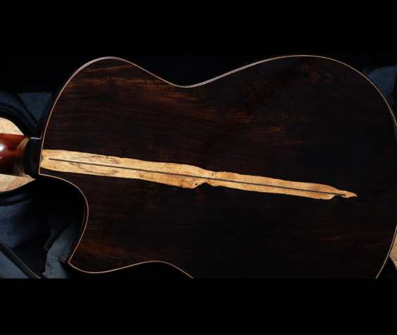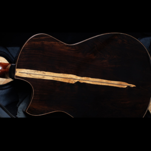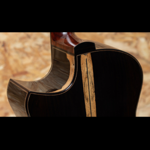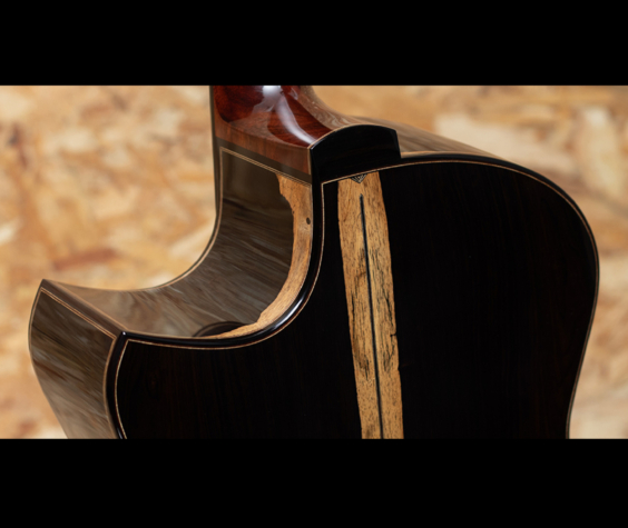 トップには南米産の希少材アレルセを採用。ヒノキ科に属しながら“チリ杉”とも呼ばれるこの材は、杉のような軽やかさとヒノキのような張りと緻密さを併せ持ち、澄み切った透明感と美しい倍音を湛え、優れたレスポンスと立体感のあるサウンドを奏でます。サイド&バックには高密度で硬質なアフリカンブラックウッドを用い、重厚な低音域と煌びやかな高音域を両立し、深みのある音響空間を描き出します。