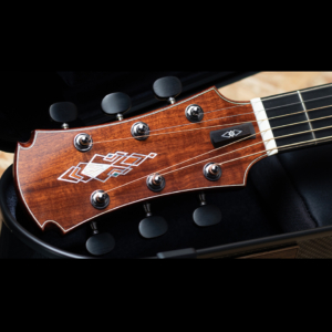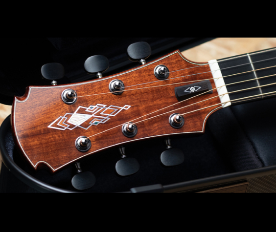そしてOGAWA INLAY CRAFTによるインレイワーク。寄木細工のロゼッタからインスパイアされたカスタムデザインで、ヘッドインレイには白蝶貝とメイプル材、アンボイナ材、そしてグリーンのスタビライズドウッドを組み合わせ、華やかで個性的な意匠を表現。加えて指板およびロッドカバーのインレイも統一感あるデザインで仕上げられ、芸術性を帯びた装飾が楽器全体に特別な存在感を与えています。