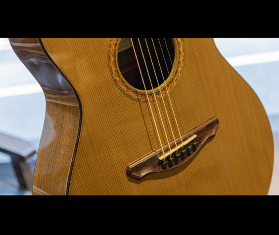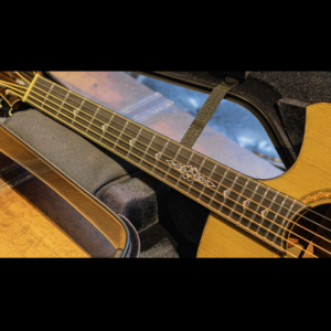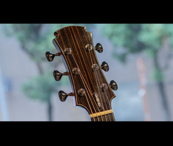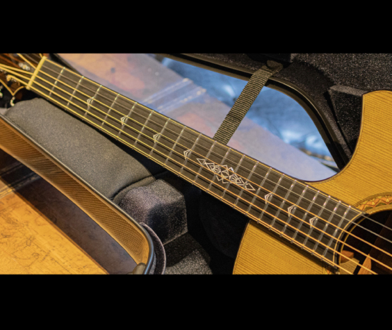本器は神代木を使用した特別な”OM-cw"に、藤井さんの作る美しい寄木細工にインスパイアされた細い線が折り重なる豪奢なカスタムインレイワークが華やかに色添えをする1本。