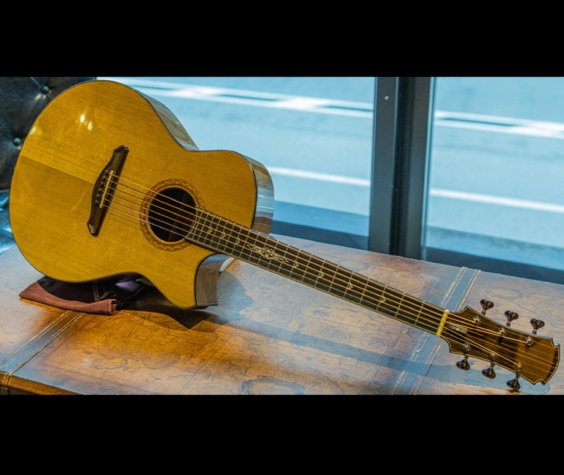 本器はカッタウェイを備えた”OM-cw”。弊社三木楽器株式会社の創立200周年を迎えるにあたり、3本の特別モデルをオーダーさせていただいた記念モデルのうちの1本。新潟・十日町にてハンドカットに拘ったインレイクラフトを勤しむ”Ogawa Inlay Craft”小川 貴之氏とのタッグモデルで、それぞれにコンセプトインレイを施してもらっています。