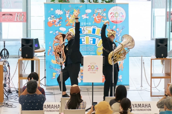 ボーカル・フルート・ハープ・津軽三味線など、MIKIミュージックサロン講師による様々なジャンルの演奏をお楽しみいただきました。(画像2,3枚目)一部のステージでは、実際にレッスンにお通いいただいている生徒様の演奏もあり、三木楽器の音楽教室で習うことの楽しさが伝わったのではないでしょうか。(画像4枚目)講師ライブだけではなく、ユーフォマン(ユーフォニアム)とチューバマン(チューバ)の2人組による「TubamanShow」のステージ(画像1枚目)に、ラテン系パーカッショニスト&ドラマー・チーチョ西野さんのパーカッションワークショップ(画像5枚目)も開催!お子様から打楽器経験者さんまで一斉にリズムを奏でるワークショップで会場に一体感がうまれ、大変盛り上がりました!