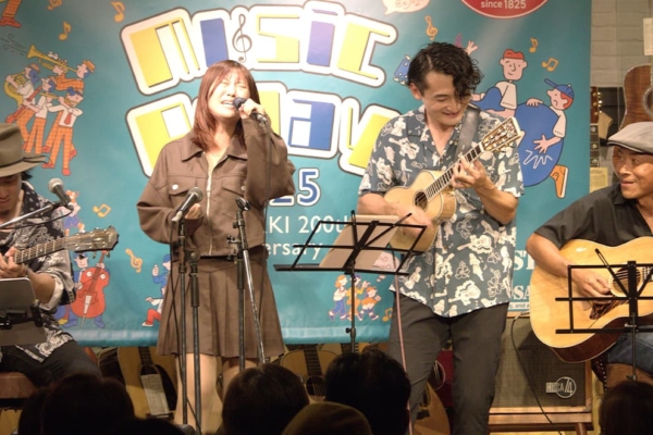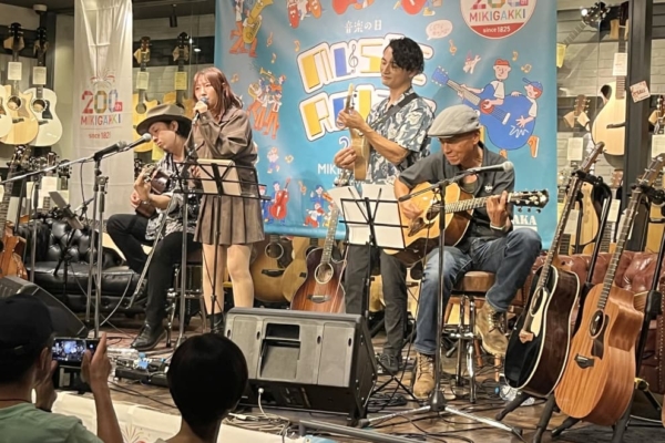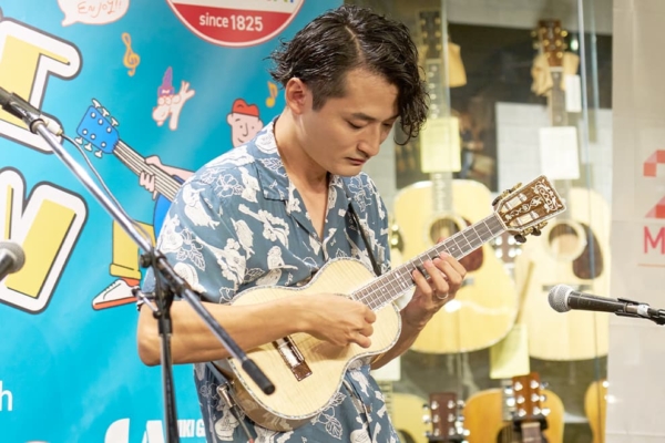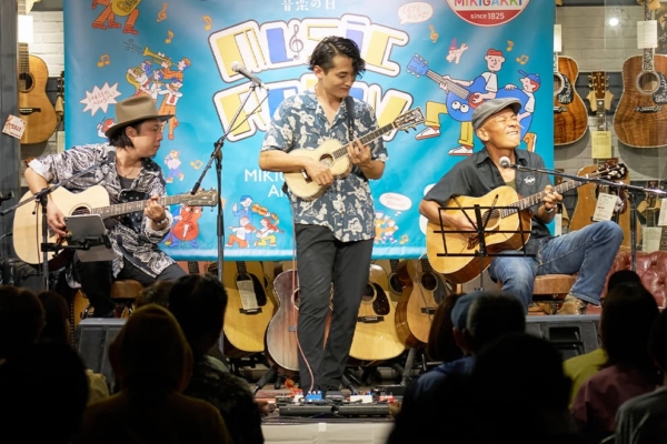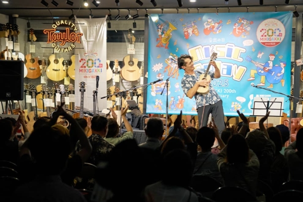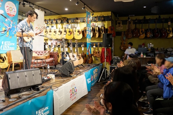 ご自身の手作りの占部ウクレレを使用され、しっとりとした美しい演奏からアクティブな迫力のある人気のオリジナル曲などをご披露いただきました。ファンの方はもちろん、初めて演奏を見られた方は特に、名渡山さんのウクレレとは思えない迫力と超絶技巧に釘付けに。「難曲」と言われるトルコ行進曲ではお客様の手拍子と歓声などで会場が一体となり、大盛り上がり!