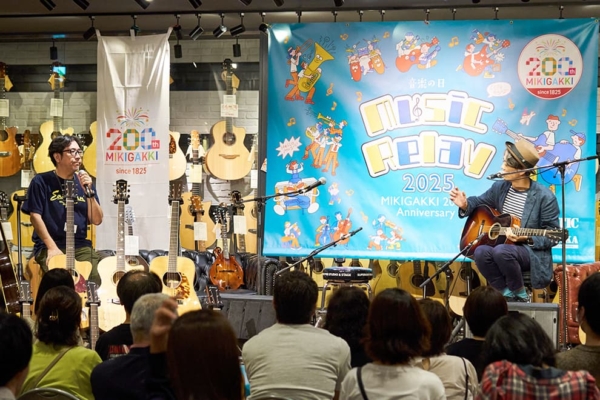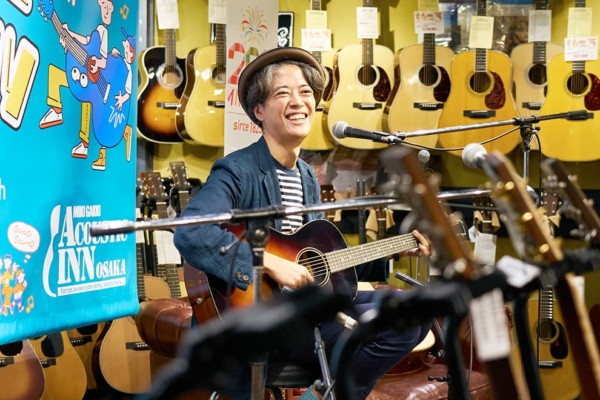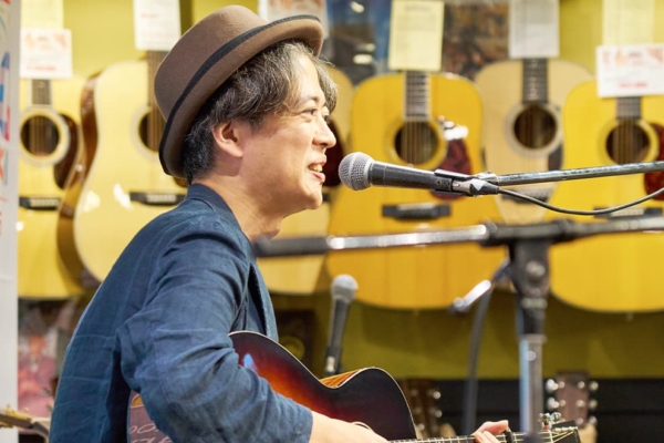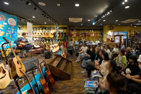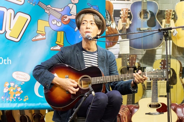 “Eastman Guitars” “Bourgeois guitars” 両メーカーのサポートのもとたくさんのギターを展示し、メーカーのSIE・猪狩氏と共に様々なラインナップの中からおすすめのモデルのサイズや材・特徴などを紹介して頂き、解説後にそのギターで1曲お届けをするという形でのライブを行っていただきました。