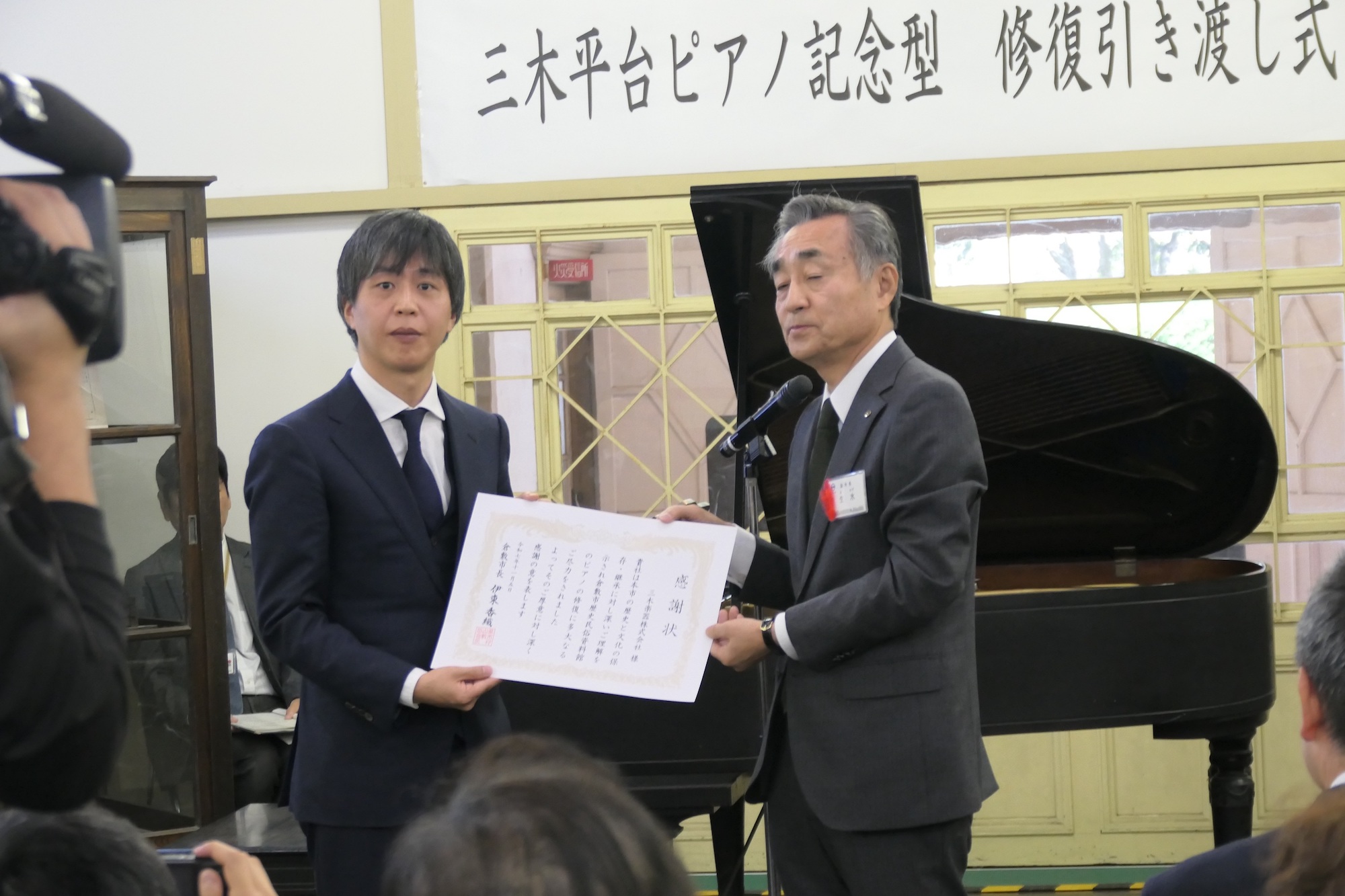 倉敷市歴史民俗資料館に展示されている昭和9年製のグランドピアノ(S.MIKI)の修復事業に関し、11月5日に開催された「三木平台ピアノ記念型 修復引き渡し式」にて、倉敷市より感謝状を賜りました。