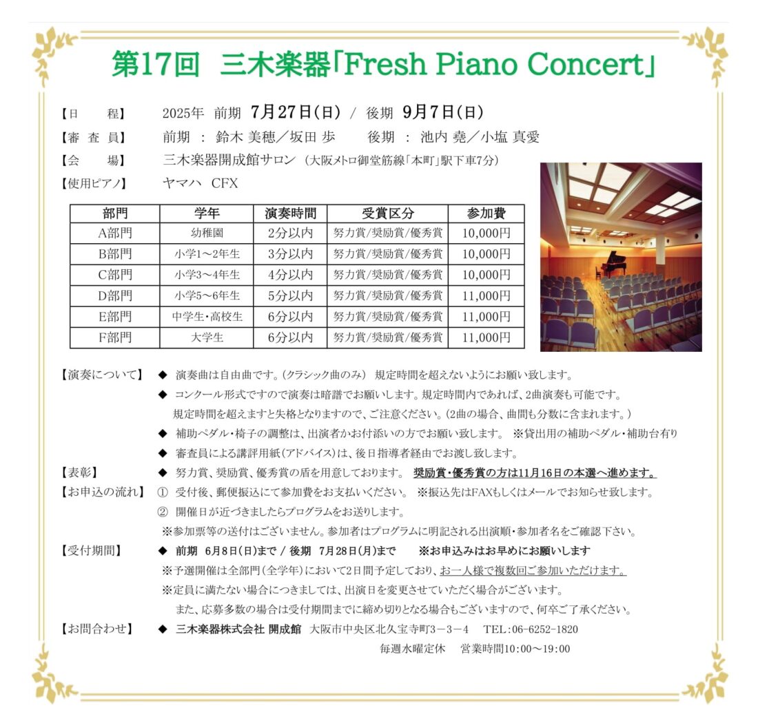 第17回フレッシュピアノコンサートを、下記要領で開催いたします。
